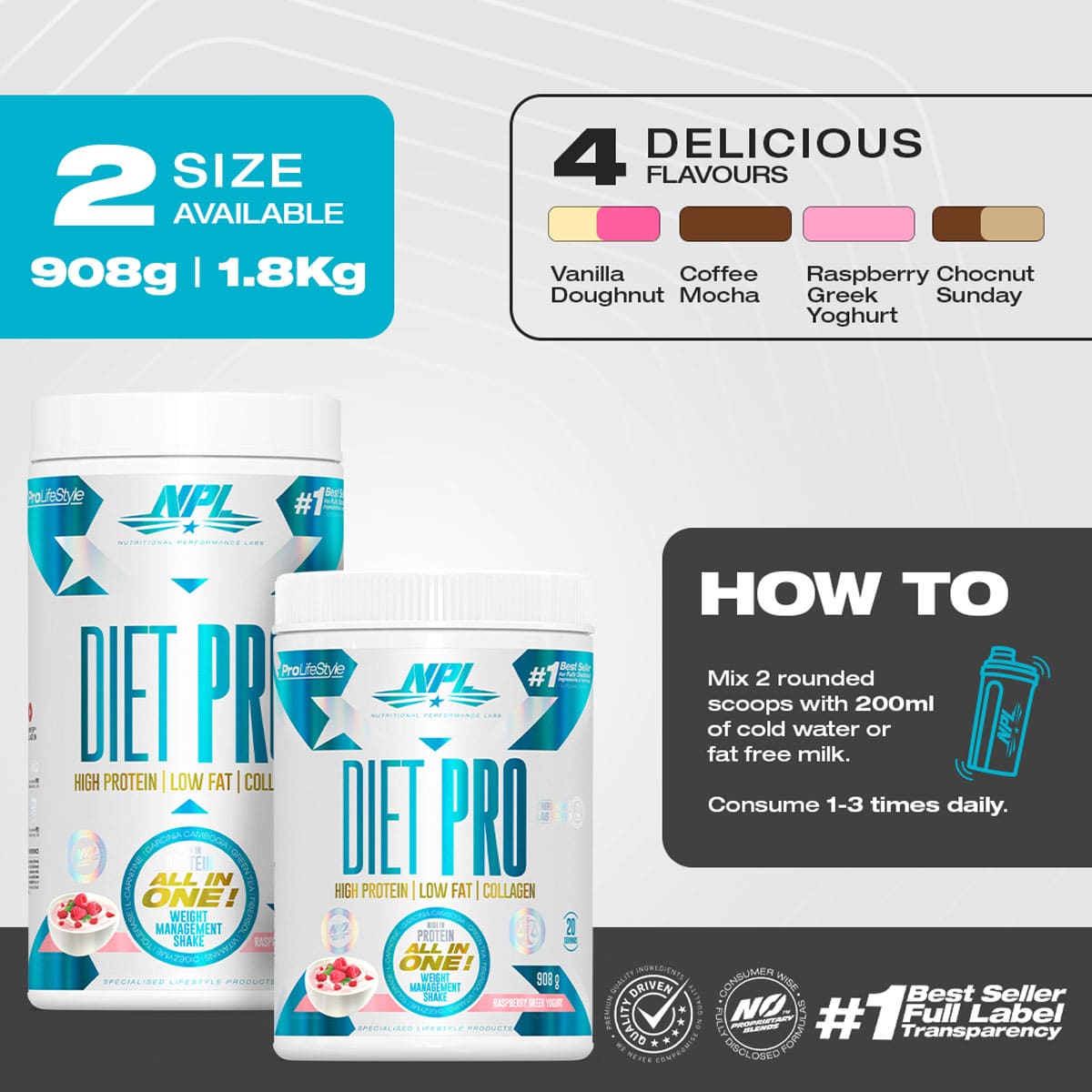 DOSAGE: Mix 2 rounded scoops (approx 45g) with 200ml of cold water or fat free milk. Have 1-3 servings daily. Health supplements are intended only to complement health or supplement the diet.