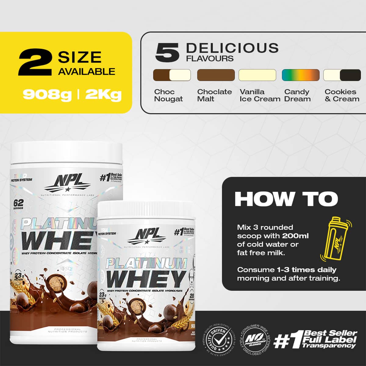DOSAGE: Add 3 slightly rounded scoops (32g) to 200ml of cold water or fat free milk and consume 1 – 3 times daily. Consume in the morning and post training as protein is generally at its highest demand at these times. Use additional servings as needed to fulfill your protein requirements or as directed by your healthcare practitioner or fitness advisor. Serving size and mixing ratios may be adjusted to meet individual requirements and taste preferences.