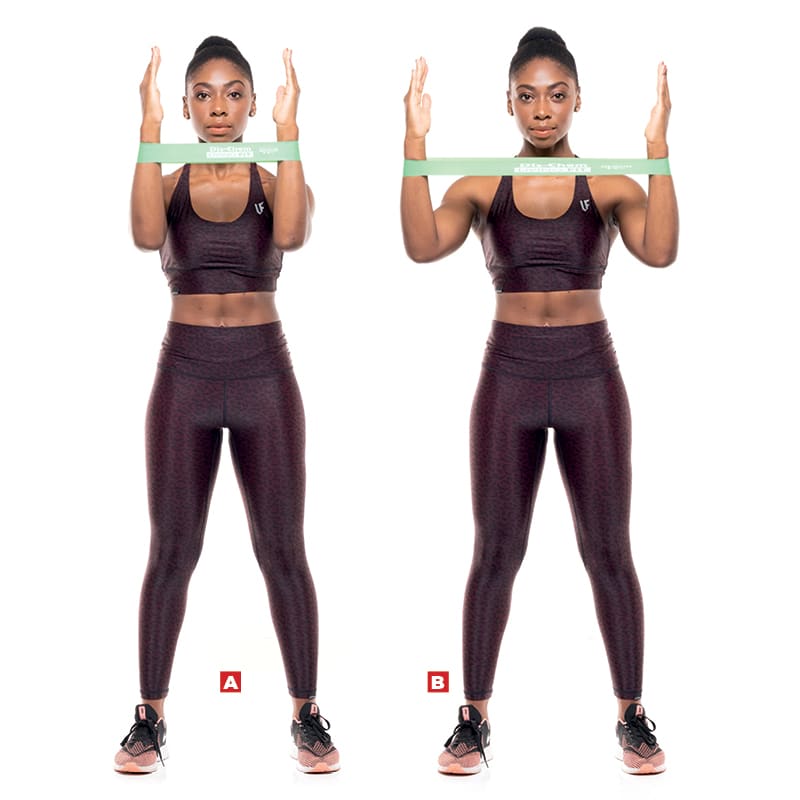 Place the mini band around your wrists and bend your arms in front of you at chest height. Pull the mini band apart.