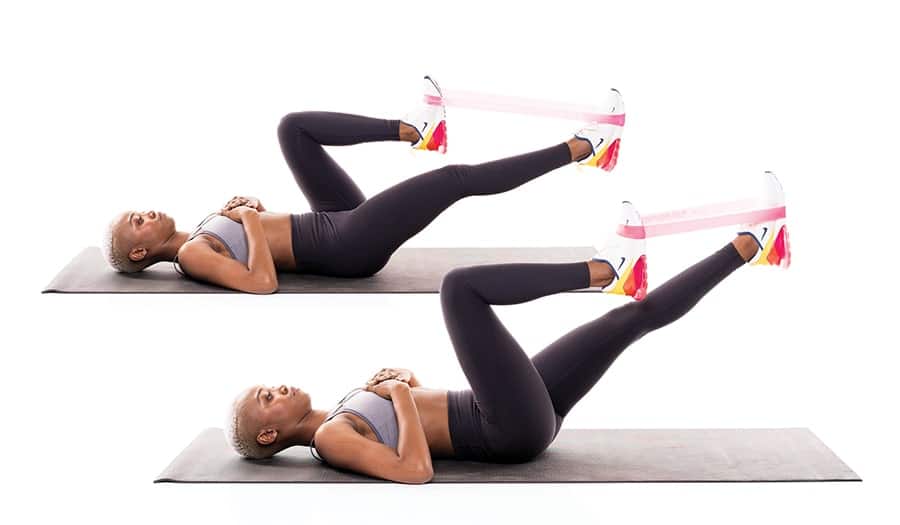 DOING THE MOVE: Lie on your back with your legs lifted off the floor at 90 degrees and the band around your feet. Kick one leg out into a fully extended position. Return the band to the starting position under control. Alternate this motion for the required reps.